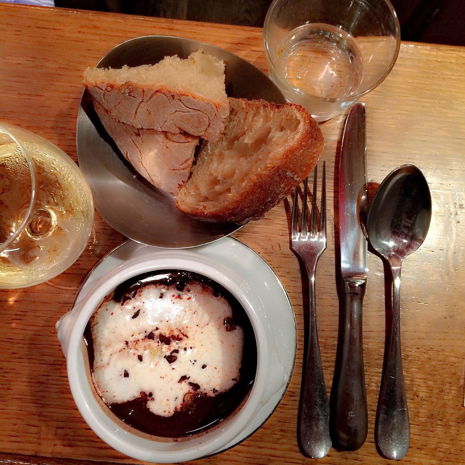 Em seguida, um dos melhores caldos do ano: uma sopa de caça com creme, azeite e favas de cacau. Não sei qual era a caça, mas a vítima fui eu.